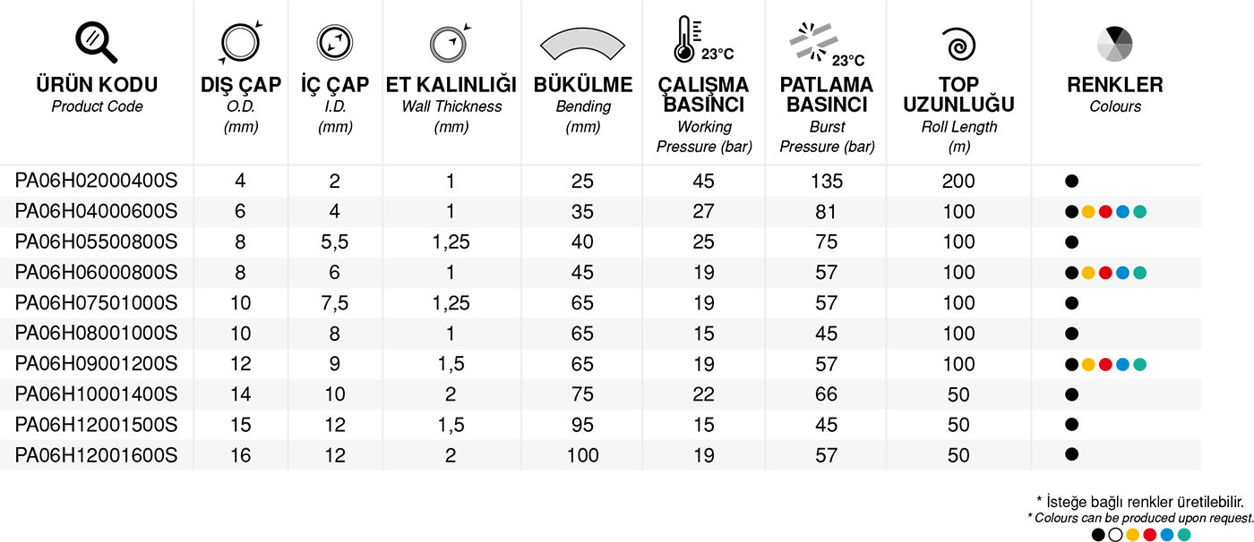 Polyamide 6 (PA6) tubes acc to DIN 73378 with ,HIPH,HIHL,HL types . Other Approved norms ISO 7628 / SAE J844 / DOT/ BS 5409. Mostly using application ; Automative air brake line systems , fuel and oil transfer lines, vacumm air systems , clutch air systems , cooling lines , air suspensions lines , trailer air brake systems, pneumatics air lines, automation systems tubes, misting high pressure tubes,tufting textile antistatic tubes,hoses.